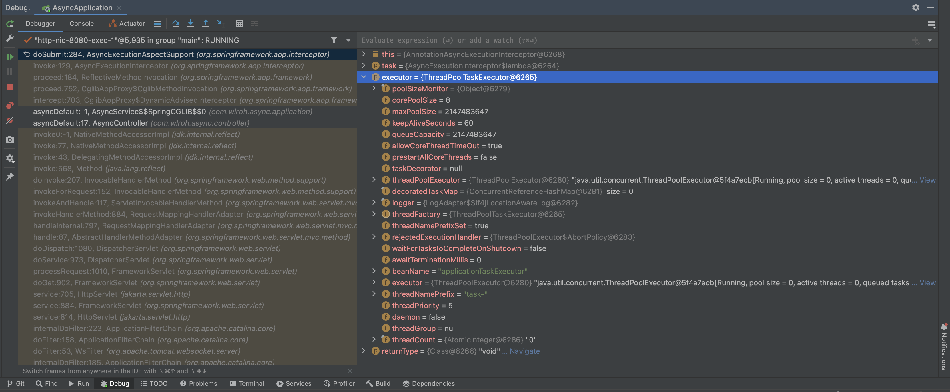 디버깅한 결과 executor의 구현체로 ThreadPoolTaskExecutor 를 사용하는 것을 확인할 수 있습니다.