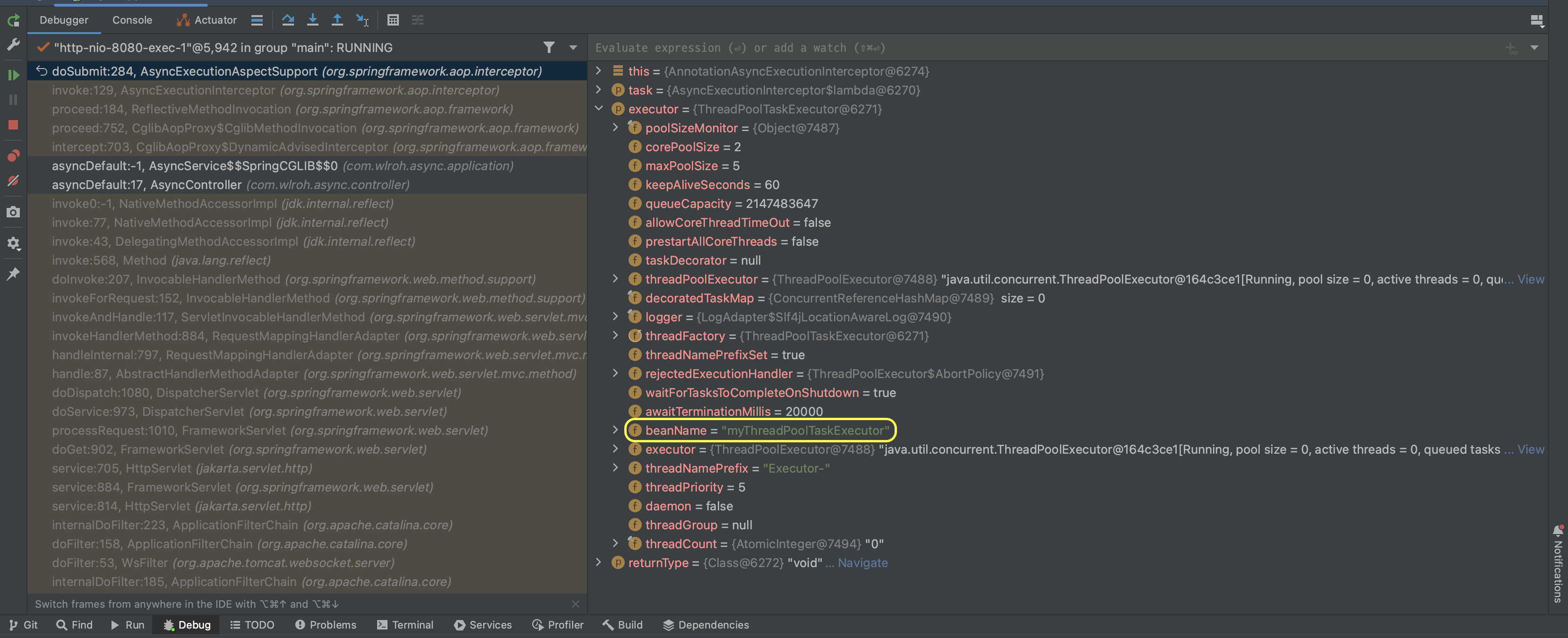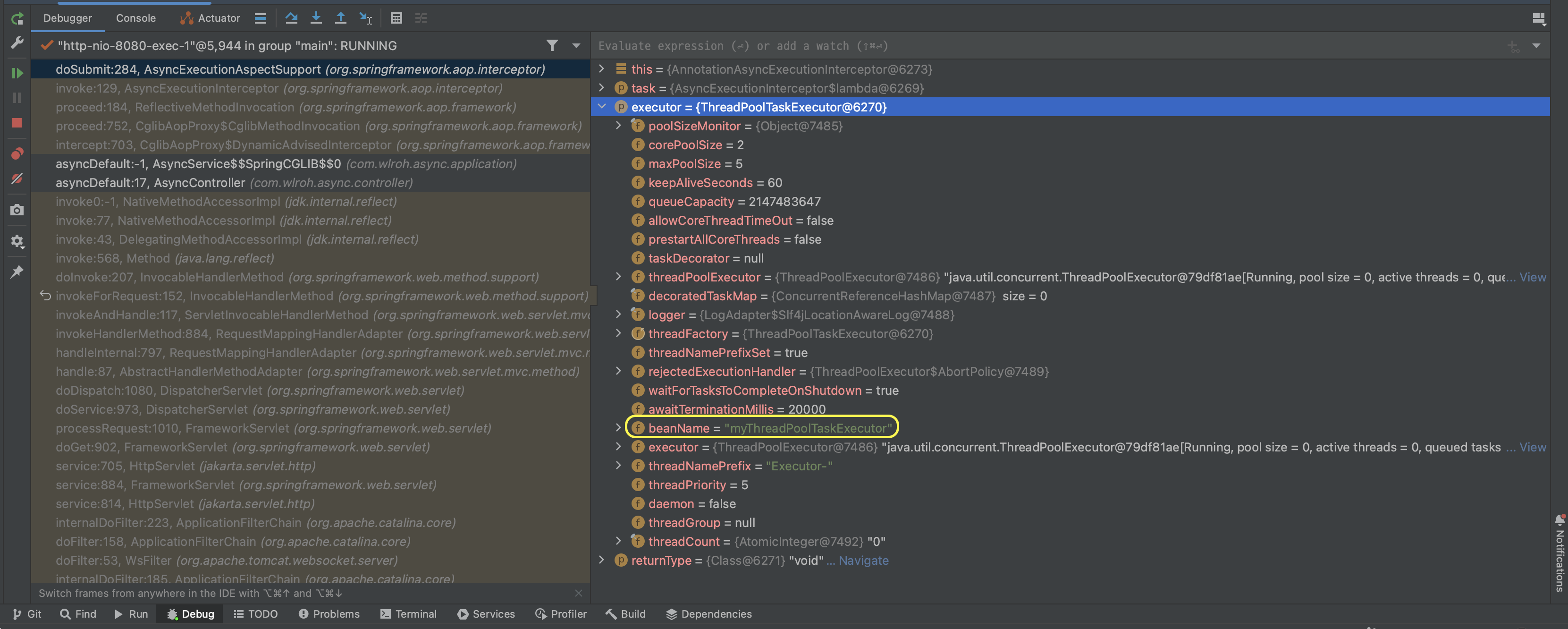 디버깅한 결과 executor의 구현체로 ThreadPoolTaskExecutor 로 사용하며, beanName이 myThreadPoolTaskExecutor 인 것을 확인할 수 있습니다.